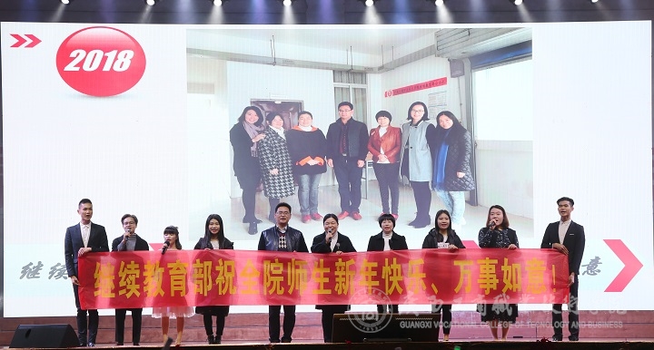 ? ? ? ? 1月5日晚,我院在校本部文體館舉行2018年教職工迎新晚會。學(xué)院領(lǐng)導(dǎo)黨委書記覃武云,黨委副書記、紀(jì)委書記蒙啟成,副院長李仕欽,副院長李維親臨現(xiàn)場欣賞晚會。參加和觀看晚會的還有學(xué)院全體教職員工及2016級、2017級學(xué)生代表。據(jù)悉,本次晚會共20個節(jié)目參演,形式多樣,內(nèi)容豐富。