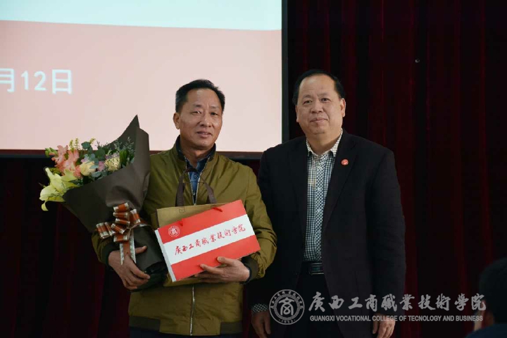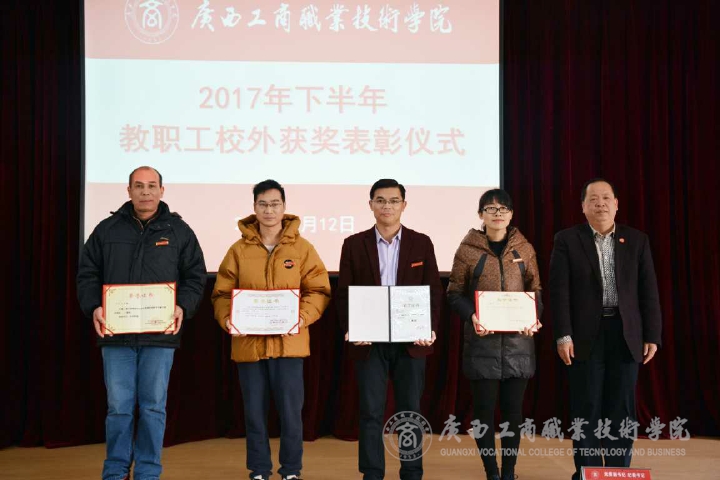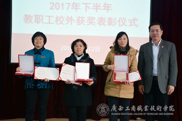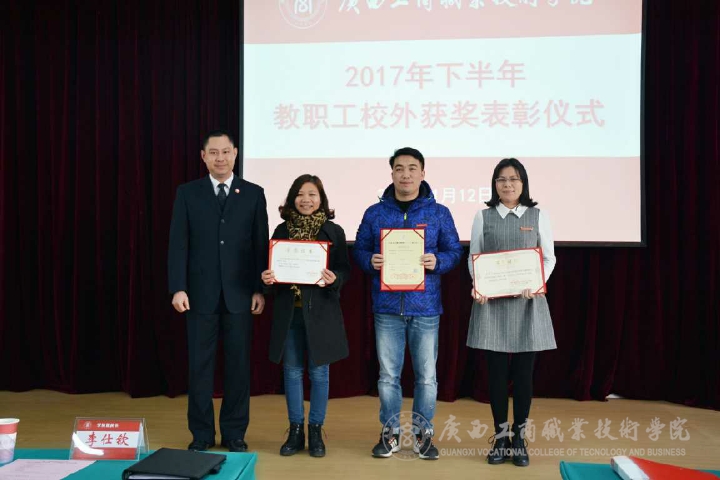 ??????? 會上,蒙啟成首先宣讀了2017年下半年退休人員名單,并由李仕欽和李維為退休人員頒發榮休證書和榮休紀念品。接著,蒙啟成對《關于2017年度學院教職工榮獲校外集體獎和個人獎項目的情況通報》進行宣讀,并對獲獎的教師表示祝賀和肯定。表彰儀式上,由李仕欽,李維,陳寧春分別為獲獎教師代表頒獎。