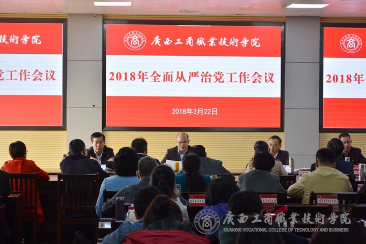 ? ? ? ? 會議由蒙啟成同志主持,覃武云同志代表黨委作2018年全面從嚴治黨工作報告,圍繞2017年學院全面從嚴治黨工作情況作總結,對我院全面從嚴治黨面臨的形勢與存在的問題進行分析研判,就2018年學院全面從嚴治黨工作作出部署。