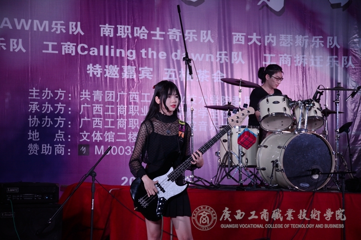 ? ? ? ? 首先出場的是來自廣西大學(xué)行健文理學(xué)院的“槍紅樂隊”,“槍紅樂隊”是一支流行搖滾風(fēng)格的樂隊,為我們帶來了《我的天空》等歌曲,樂隊精彩的表演把現(xiàn)場的氣氛帶動起來,現(xiàn)場氛圍熱烈。