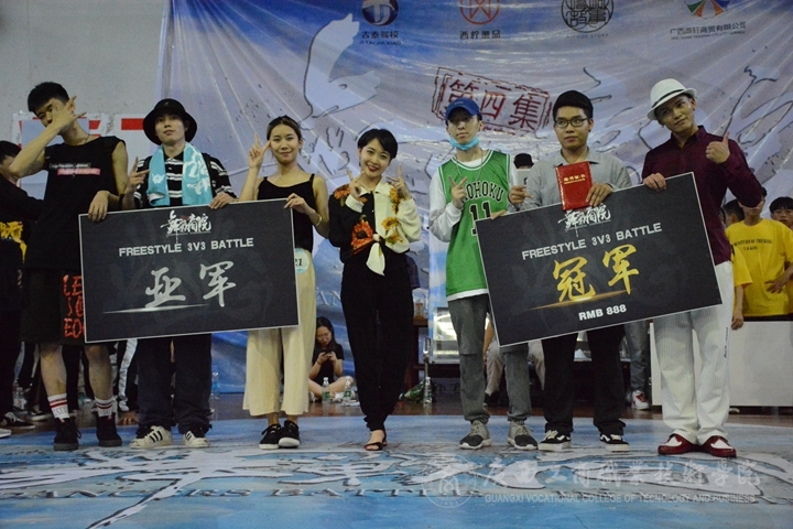 ? ? ? ? 最后經過激烈的決戰,“飛龍在天”戰隊冠軍贏得了freestyle3v3賽項的冠軍,“西城老男孩”拿下了Breaking賽項的冠軍,來自南寧職業技術學院的阿威贏得了seven to somke單人車輪戰的冠軍。賽后,來來老師和貓仔老師表演個人solo,在觀眾們熱烈的歡叫聲中,本次“舞戰商院”街舞大賽圓滿結束。