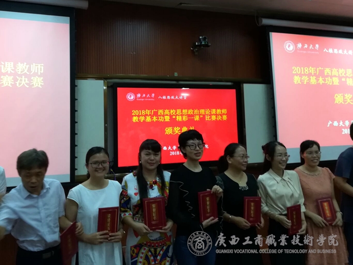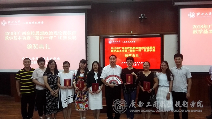 ? ? ? ? ?2018年 9月1日,由自治區高校工委、教育廳主辦,廣西大學馬克思主義學院承辦的2018年廣西高校思想政治理論課教師教學基本功暨“精彩一課”比賽決賽落下帷幕,我部林勇靈老師參賽,部門全體老師現場觀摩。