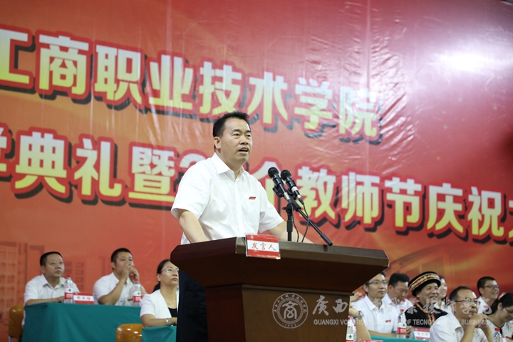 學院院長陳杰為新生開學典禮致辭,陳杰代表學院對新入學的2018級3678名新生表示熱烈的歡迎,為培養人才付出辛勤汗水和心血的教師表示感謝。會上,陳杰發表題為《今天的太陽和昨天的不一樣》講話。他說,今天的廣商院與昨天的有三個不一樣。第一,今天的學校和昨天的不一樣。廣商院65年來,數度易址,多次更名,歷經坎坷,不斷進取。當前學院已經進入“十三五”規劃的后半程,正從打造廣商院升級版向著爭創廣西“雙高”職業院校邁進。第二,今天的老師和昨天的不一樣。教師隊伍的主打學歷,由??浦鞔颉⒌奖究浦鞔颉⒌窖芯可鞔?、到碩士主打,并向著博士帶頭人升級發展。第三,今天的學生和昨天的不一樣。今天的中國發生了歷史性變革,學生面對的環境今非昔比。會上,陳杰院長,尋找生日與教師節一天的同學,他念出了學院查找到的十位生日與教師節一樣的新同學名單,為他們的18歲成人禮送上祝福。最后,陳杰祝同學們開學開心,好好學習,天天向上,祝老師們節日愉快,身體健康,事事順利!祝廣商院前程似錦,碩果累累,明天更好!