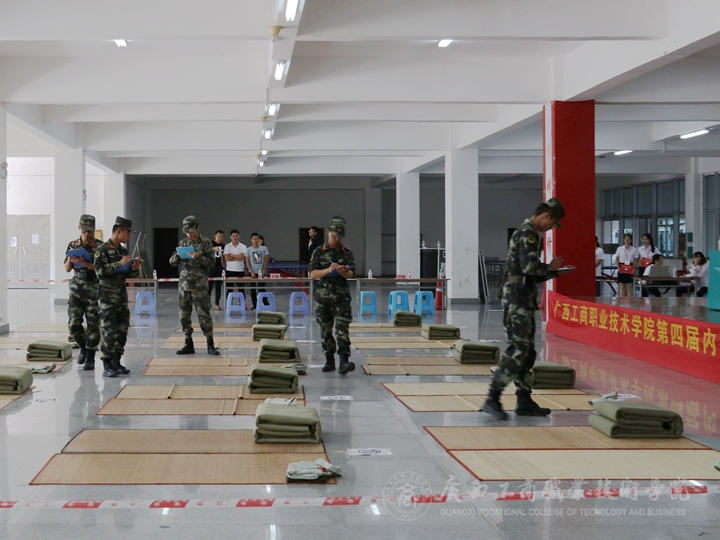 近日,廣西工商職業技術學院新生軍訓疊被內務決賽在學院鵬飛校區文體館一樓舉行。出席本次內務能手決賽的老師及嘉賓有:李金霖老師、練東曦老師以及武警廣西總隊直屬支隊王裕捷排長和教官們。本次內務能手整理大賽由葉珊珊主持。