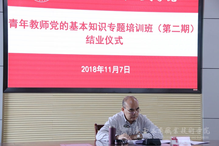 ? ? ? ?緊接著由覃武云為學員代表頒發證書。最后覃武云在講話中對青年教師提出三點建議:一是要多學?;畹嚼蠈W到老,多學習黨的基本理論,多翻閱黨的經典著作等;二是要多思,結合“你是中國人嗎”“你愛中國嗎”“你愿意中國好嗎”三問,鼓勵大家要經常帶著問題思考,善于發現問題,做好本職工作;三是要多做。要深入踐行為人師表,善做善成,將理論聯系實際,真正做到愛崗敬業和誠信友善。