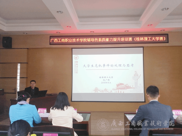 上午九點,桂林理工大學學工部副部長馮廣輝作關于“危機事件處理”的專題講座。馮部長深入淺出地講解危機事件的概念、類型及特征,期間穿插了大量生動詳實的危機事件典型案例,通過案例分析,得出一套明晰的、完整的、可操作性強的危機事件處理方法與策略,并且針對危機事件處理,給輔導員提了四點建議,附送了三個“錦囊妙計”。學員紛紛表示聽了馮部長的講座,獲益匪淺,既增長了見識,又打開了思路,對今后處理危機事件更有信心了。