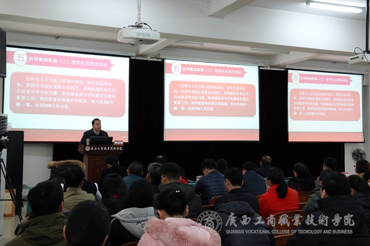 2019年1月11日,學院于鵬飛校區2145報告廳召開2018—2019學年第一學期期末大會,學院黨委書記覃武云、院長陳杰、黨委副書記、紀委書記蒙啟成、副院長李仕欽、副院長陳寧春出席,各部門、各單位負責人、全體教職工參加了會議。本次會議由覃武云書記主持。