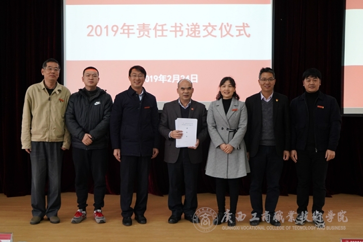 ? ? ? ? 會議第一項議程是遞交責任書儀式。為了推動2019年黨建工作、意識形態工作和安全穩定工作的落實,進一步壓實工作責任,學院黨委與各黨總支、直屬黨支部書記簽訂《2019年黨建工作目標責任書》、《2019年落實意識形態工作主體責任責任書》,與各黨組織、各部門、各單位主要負責人簽訂《2019年安全穩定工作責任書》。會上,各黨組織、各部門、各單位主要負責人依次向學院遞交責任書,由覃武云同志代表學院黨委接收責任書。