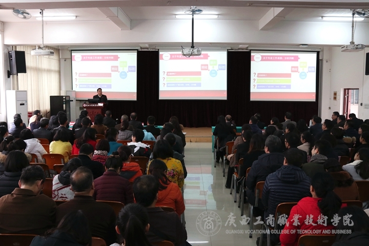 ? ? ? ? 2月24日上午,我院于鵬飛校區教學樓報告廳召開學院2019年春季學期開學大會。本次大會由學院黨委書記覃武云主持,院長陳杰在會上做開學工作報告。我院領導班子成員及全體教職工參加會議。