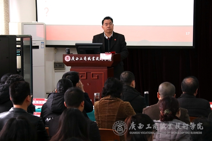 ? ? ? 會議的第四項議程是由陳杰同志做題為《一年之計在于春——在2019年春季開學大會上的講話》開學工作報告。他緊緊圍繞:年度工作遵循、黨的全面領導、以教學為中心、管理服務育人、工作重大專項五大方面做報告。最后,他引用習近平總書記2019年發表的新年賀詞“我們都在努力奔跑,我們都是追夢人”,勉勵全體廣商院教職員工在新的一年里,努力取得更多好成績。