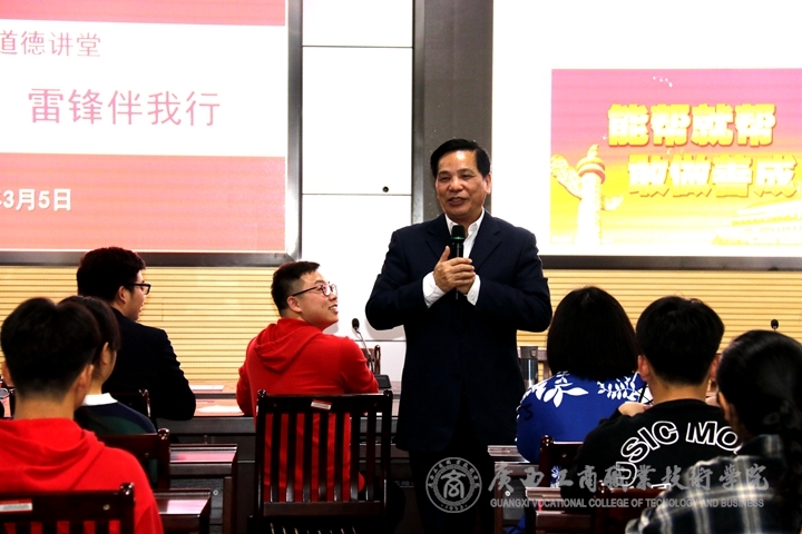 ??????? 首先由學(xué)院黨委書記覃武云為現(xiàn)場(chǎng)師生們講解雷鋒精神的內(nèi)涵和如何傳承弘揚(yáng)雷鋒精神。覃武云用形象生動(dòng)的語(yǔ)言和珍貴的歷史圖片影像簡(jiǎn)要介紹了雷鋒同志的生平、主要事跡、雷鋒紀(jì)念日的由來(lái),鮮活再現(xiàn)了雷鋒同志平凡而又偉大、可敬而又可親的人物形象。