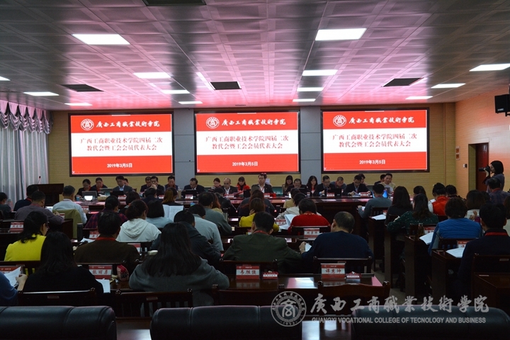 ???????? 2019年3月5日下午,我院在鵬飛校區報告廳召開四屆二次教代會暨工會會員代表大會。學院黨委書記覃武云、院長陳杰、黨委副書記、紀委書記蒙啟成、副院長李仕欽、副院長李維、副院長陳寧春及正式代表70人、列席代表11人、特邀代表2人參加本次會議。