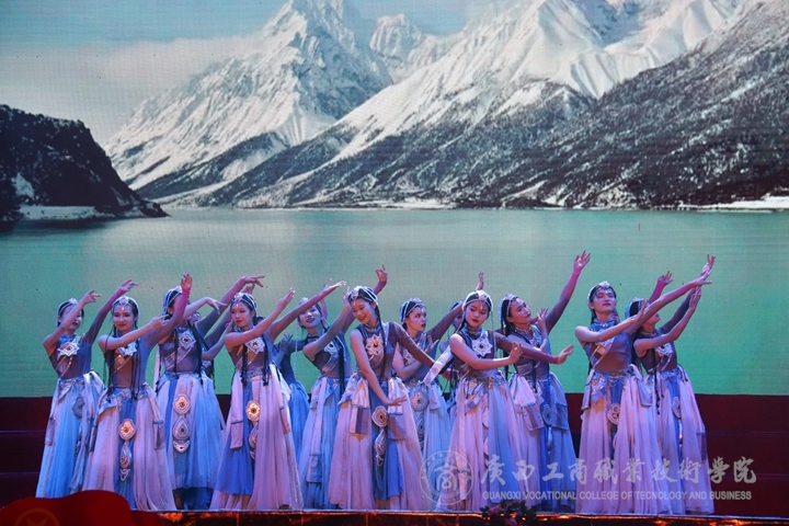 第三篇章是《青春圓夢》。酒店1703班的孔潔莉同學帶來魔術舞蹈《雪落下的聲音》,曼妙的舞姿,新穎的表演方式讓觀眾沉浸在其中;學院合唱團表演歌舞《向往》,歌聲悠揚,舞姿柔美,把現場氣氛推向高潮。