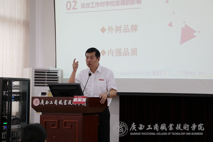 ? ? ? ? 5月21日下午,我院于鵬飛校區(qū)2145報(bào)告廳召開內(nèi)部質(zhì)量保證體系診斷與改進(jìn)工作推進(jìn)會(huì)。學(xué)院院長陳杰、黨委副書記、紀(jì)委書記蒙啟成、副院長李仕欽、副院長李維、副院長陳寧春出席會(huì)議。全體中層干部、各系部全體教師、教務(wù)科研處、黨委學(xué)生工作部、黨委教師工作部、現(xiàn)代教育技術(shù)中心和評(píng)估督導(dǎo)室相關(guān)人員等參加會(huì)議,本次會(huì)議由院長陳杰主持。