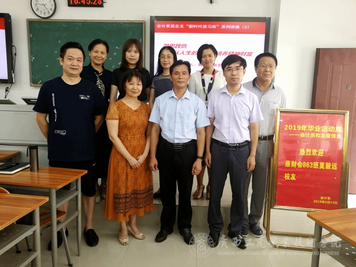 ? ? ? ? 2019年6月14日下午,會計系黨總支在學院鵬飛校區教室舉辦“新時代講習所”系列講座暨2019年畢業周校友報告會。86級校友莫毅遠給會計系教師黨員和2018級學生帶來了一場精彩的報告會。