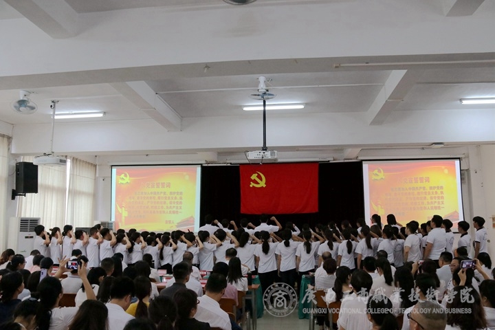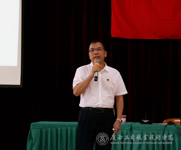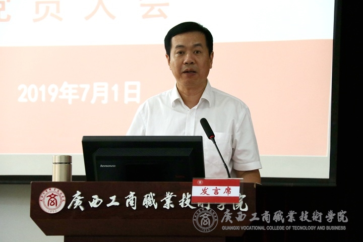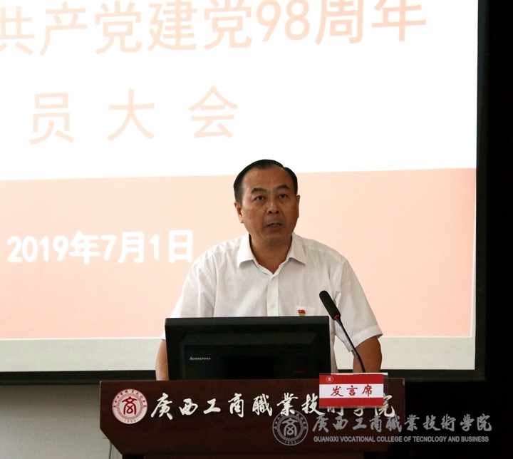 ? ? ? ? 7月1日下午,為深入學習宣傳貫徹習近平新時代中國特色社會主義思想和黨的十九大精神,做好“不忘初心、牢記使命”主題教育籌備工作,推進學院2019年黨建重點工作部署,增強黨的凝聚力和戰(zhàn)斗力,? 我院于鵬飛校區(qū)教學樓會議室召開中共廣西工商職業(yè)技術學院委員會慶祝中國共產黨建黨98周年黨員大會。學院全體在職教職工黨員、離退休教職工黨員代表、新入黨學生黨員、教職工入黨積極分子參加本次會議。會議由黨委副書記、紀委書記蒙啟成同志主持。