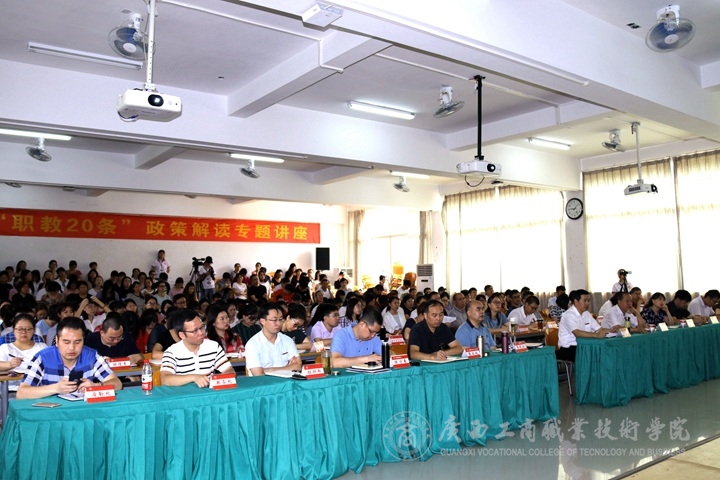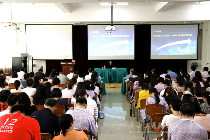 ? ? ? ? 為進(jìn)一步貫徹落實(shí)《國(guó)家職業(yè)教育改革實(shí)施方案》精神,持續(xù)推進(jìn)學(xué)院產(chǎn)教融合、校企合作、立德樹(shù)人工作,7月8日上午,我院于鵬飛校區(qū)教學(xué)樓報(bào)告廳邀請(qǐng)了教育部職業(yè)技術(shù)教育中心研究所評(píng)估中心副主任、全國(guó)職業(yè)教育集團(tuán)化辦學(xué)工作專(zhuān)家組成員周鳳華教授作題為《< 國(guó)家職業(yè)教育改革實(shí)施方案>背景下職業(yè)教育產(chǎn)教融合校企合作的實(shí)踐路徑與思考》專(zhuān)題講座。學(xué)院黨委書(shū)記覃武云、院長(zhǎng)李維、黨委副書(shū)記蒙啟成、副院長(zhǎng)李仕欽、副院長(zhǎng)陳寧春及全體職教工現(xiàn)場(chǎng)聆聽(tīng)了講座。
