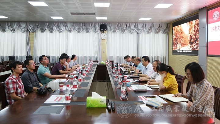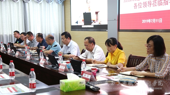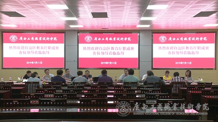 ??????? 7月11日下午,自治區(qū)教育廳職成處處長覃壯才、副處長黃云奇一行7人蒞臨我院檢查指導(dǎo)工作并開展“不忘初心、牢記使命”專題調(diào)研活動。學(xué)院全體領(lǐng)導(dǎo)班子成員和相關(guān)部門負(fù)責(zé)人參加座談交流。