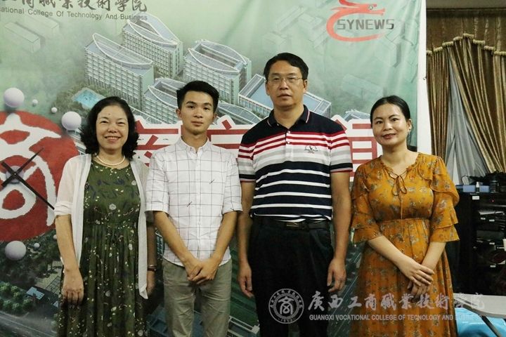 (自治區糧儲局調研員冼一紫、廣西工商技師學院校長助理黃斌、黃斌同學與新聞中心指導老師莫惘合影)
