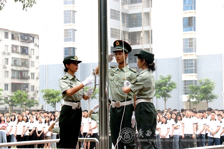 ??????? 隨著儀式正式開始,學院督察隊成員邁著鏗鏘整齊的步伐來到了國旗臺下。在激昂的《義勇軍進行曲》中,鮮艷的五星紅旗迎風冉冉升起,全體師生行注目禮,共同奏唱國歌。