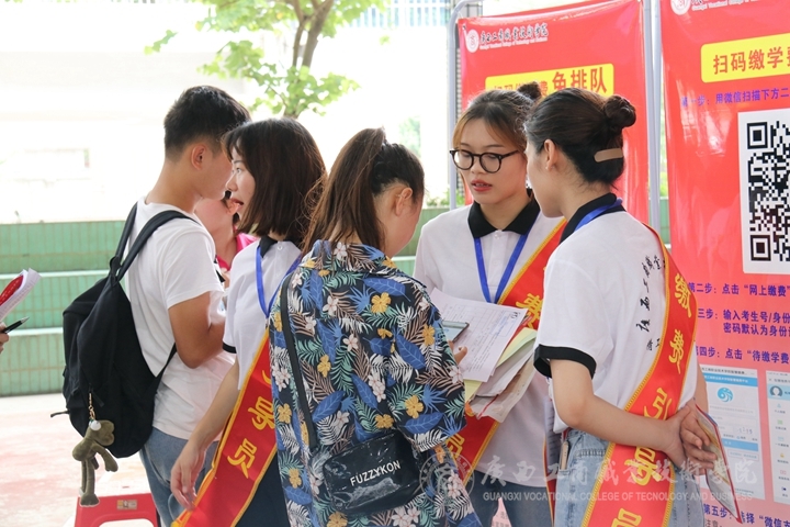 ??????? 隨著新生陸續的到來,迎新工作也如火如荼的進行著,報到現場井然有序,工作人員熱心的接待每一位新同學,替他們搬運重物,為他們細心解答。學院督察隊也是迎新隊伍中一道亮麗的風景線,他們分布在校園各處,如一棵棵蒼勁的松柏,不懼酷暑炎炎,挺立在崗位上,維持現場秩序。在今年的新生接待中,有一百多名財信系志愿者,他們穿著玫紅色的系服佩戴工作牌,引領遠道而來的新生和家長完成注冊,縱使驕陽似火也絲毫不能減去他們的熱情。