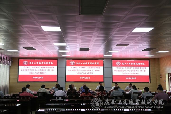??????? 2019年9月25日下午,我院于鵬飛校區視頻會議室召開“不忘初心、牢記使命”主題教育讀書班暨學院黨委理論學習中心組專題學習(第一期)——全面從嚴治黨專題研討會。學院黨委理論學習中心組成員和其他處級以上的黨員領導干部參加本次會議。會議由學院黨委書記覃武云主持。