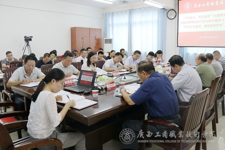 ? ? ? ? 9月26日下午,中共廣西工商職業(yè)技術(shù)學(xué)院委員會(huì)于我院鵬飛校區(qū)會(huì)議室召開(kāi)“不忘初心、牢記使命”主題教育讀書(shū)班暨學(xué)院黨委理論學(xué)習(xí)中心組“傳承紅色基因,勇?lián)氊?zé)使命”專(zhuān)題研討會(huì)。學(xué)院黨委書(shū)記覃武云主持本次學(xué)習(xí)會(huì)議并做重點(diǎn)發(fā)言及總結(jié)發(fā)言。黨委副書(shū)記、紀(jì)委書(shū)記蒙啟成,黨委委員、副院長(zhǎng)陳寧春在會(huì)上做重點(diǎn)發(fā)言。學(xué)院黨委理論學(xué)習(xí)中心組成員,學(xué)院處級(jí)以上黨員領(lǐng)導(dǎo)干部參加本次研討會(huì)。
