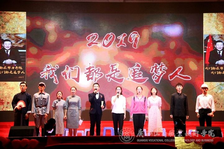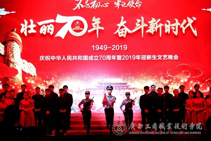 ??????? 9月29日晚,我院于鵬飛校區文體館二樓舉辦“不忘初心、牢記使命 壯麗70年,奮斗新時代——慶祝中華人民共和國成立70周年暨2019級新生文藝晚會”。學院黨委書記覃武云,院長李維,黨委副書記、紀委書記蒙啟成,副院長李仕欽出席了本次晚會;學院各系、各組織老師代表,以及17級,18級各班代表參加并觀看本次晚會。本次晚會由馬力、葛明慧、梁言騰、秦文靜、倪龍、謝瑞珍主持。