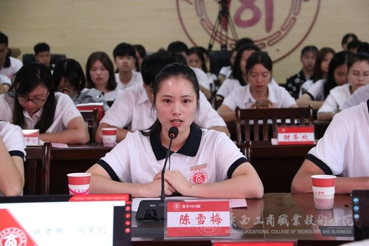 ??????? 接著,由會計系1810班陳雪梅、會計系1814班呂剛同學、會計系1809班的黃雪珍同學、經管系營銷1806班溫富良同學作為學生代表發言。他們紛紛表示,為同學服務是自己的初心和使命,在日后工作中,更要秉承這種初心和使命。黃雪珍同學表示,生活在幸福和平年代,我們應勇于擔負時代新使命,青年強,則國家強!中華民族偉大復興夢,強國夢需要全員踐行。作為一名退伍軍人的溫富良表示,退伍不褪色,做好自己的本分,當下學習是自己重要的目標,才能更好歷練人生無所不在的挑戰。???