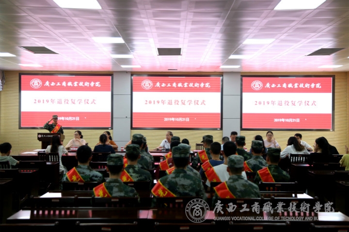 ? ? ? ? 儀式開始,由學院征兵工作站負責人黃旭艷宣讀2019年退役復學學生名單。學院領(lǐng)導李仕欽為2019年退役復學學生贈送紀念品。