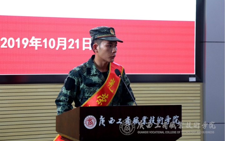 ? ? ? ? 隨后,2019年退役復學學生代表,來自工商1802班的徐仁斯同學為在場的輔導員及學生代表分享了自己在部隊的經(jīng)歷體驗與收獲。他表示,軍營生活不僅讓自己學會了堅強和忍耐,學會腳踏實地做事,同時也加深了自己對于榮譽和使命的理解,懂得了感恩和責任,錘煉了意志和作風。這是一種軍人精神,希望在場的同學們也能帶著這種精神在學校學習和生活。