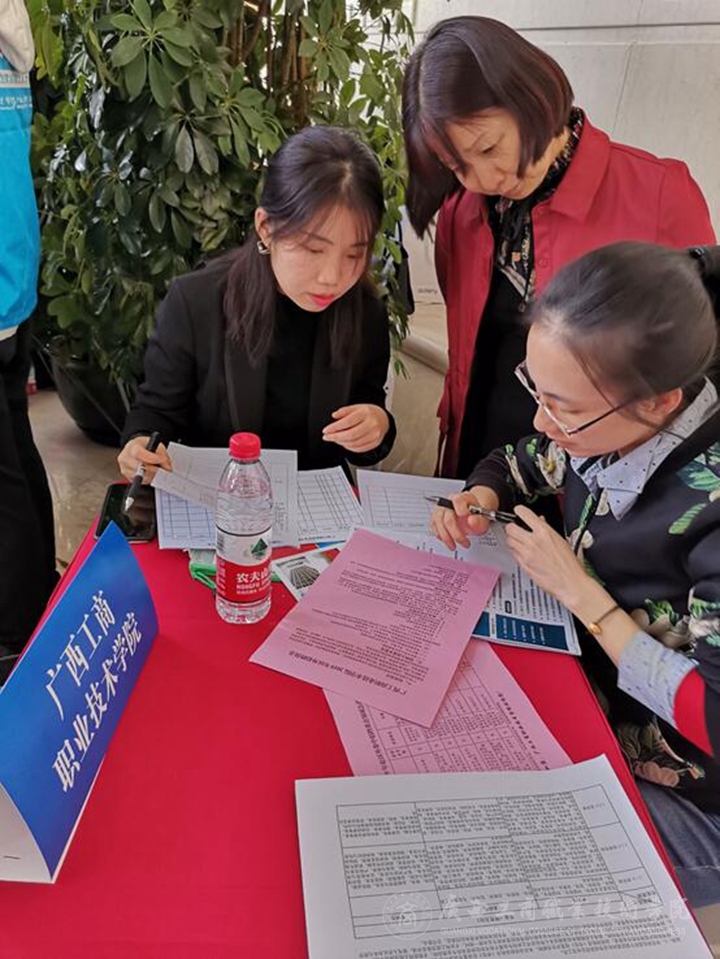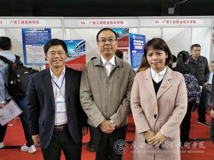 (廣西壯族自治區人力資源和社會保障廳人力資源流動管理處處長蔣艷生同志(左一)等領導蒞臨我院展位指導工作)