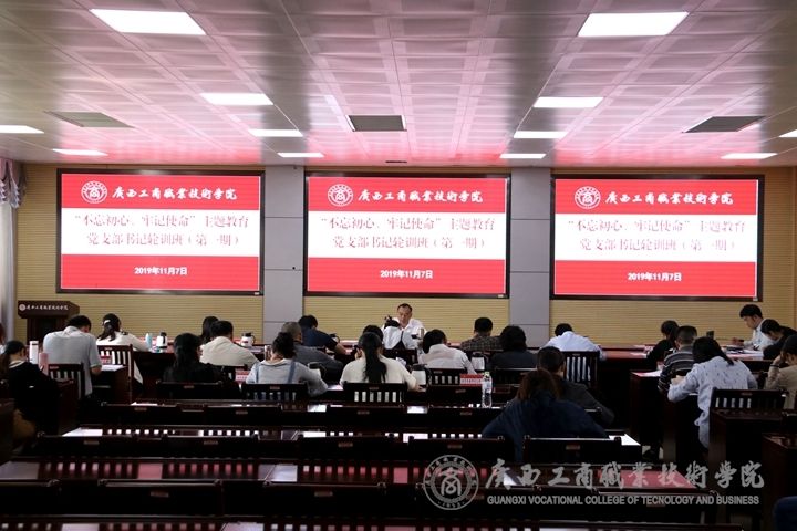 ??????? 11月7日下午,中共廣西工商職業技術學院委員會“不忘初心、牢記使命”主題教育第一期黨支部書記輪訓班開班。本次輪訓班開班輪訓課由學院黨委副書記、紀委書記蒙啟成主講。學院各黨總支書記、黨支部書記;學院紀委委員;各黨總支、支部紀檢委員;學院“不忘初心、牢記使命”主題教育領導小組辦公室相關人員;監察室、審計室全體人員參加了本次輪訓。