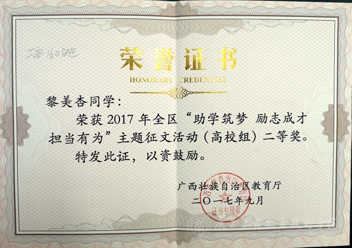 (工商1603班黎美杏同學獲資助征文比賽二等獎)