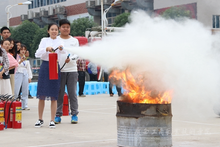 ? ? ? ?鄧錫華重點對遇到突發火災時如何自救做了詳細講解,向現場師生展示了消防服的用處,詳細介紹了滅火器的分類和使用方法。隨后,在場師生們紛紛上場進行實踐操作。