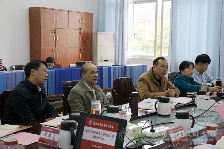 ??? 座談會上,調研組首先聽取學院黨委書記覃武云關于我院黨建工作情況的匯報,接著與會人員針對我院黨建工作有關情況開展座談交流。隨后,調研組詳細查閱了我院黨建工作臺賬資料。