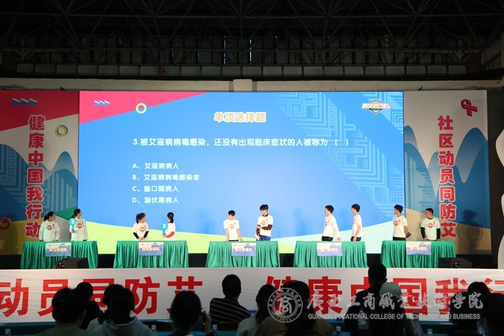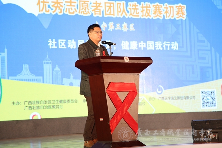 為了加強預防艾滋病健康教育工作,提高在校大學生艾滋病防御知識的知曉率,增強自我保護意識。12月2日下午,由自治區衛生健康委員會、自治區教育廳聯合主辦、自治區疾病預防控制中心、廣西工商職業技術學院承辦的2019年“世界艾滋病日”主題宣傳活動暨2019年廣西高校“防艾青年團”優秀志愿者團隊選拔賽初賽(南寧市第三賽區)在鵬飛校區文體館二樓舉辦。自治區教育廳體育衛生與藝術教育處萬鋒鋒處長,自治區衛生健康委員會艾滋病防治處處長韋輝,自治區疾病預防控制中心主任林玫、廣西工商職業技術學院黨委委員、副院長李仕欽出席本次比賽,參加活動的還有自治區疾控中心艾滋病防治專家、評委老師、媒體的記者、參賽團隊和廣西工商職業技術學院的師生代表。