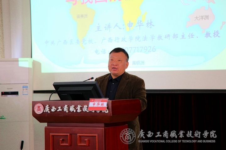 我院邀請到了中共廣西區委黨校、廣西行政學院法學教研部主任申華林教授,以《當前國際國內形勢與我國的應對策略》為主題舉辦專題講座。