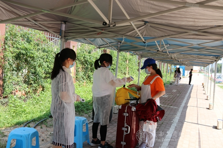 學子們陸續(xù)前來報到了,只見他們帶著行李,戴著口罩,踏進安置在校門口的帳篷中,根據(jù)地上貼好的指示標識,按1.5米間隔排隊等待著。在秩序引導員的指引下,先由工作人員對他們測量體溫,隨后行李消殺員對其行李進行消殺,同學們再來到“口罩換取點”,取掉原口罩,放進“口罩專用丟棄箱”,用免洗消毒液給雙手消毒,自取一個學院配發(fā)的新口罩戴上,隨后有序排隊到“第一次測溫點”測溫。