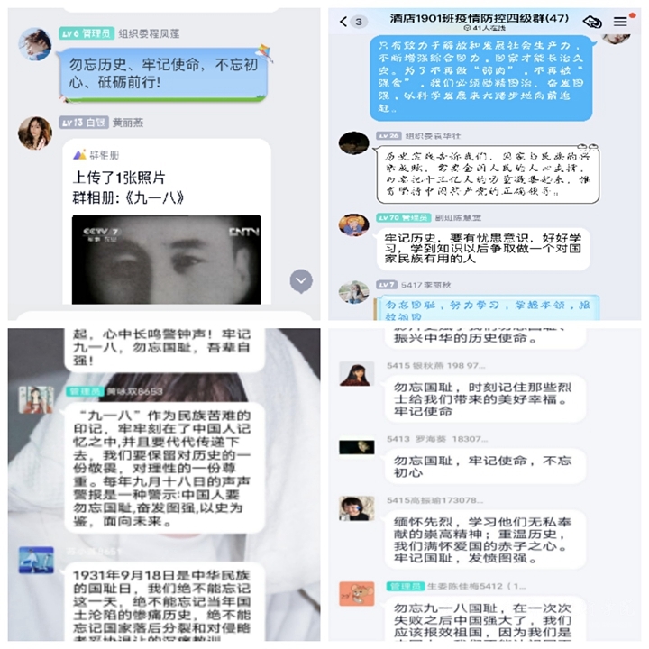 各班級組織觀看了央視頻道播放的《“九一八”真相》記錄片,隨后在班級群里展開討論。隨著紀錄片的播放,同學們一起回顧那段坎坷歲月,感受我們中華民族在當時所經歷的艱難。在討論的過程中,同學們精神振奮,情緒激昂,在共同緬懷遇難同胞,表達對先烈崇高的敬意和深深的悼念之情的同時,不忘相互激勵。