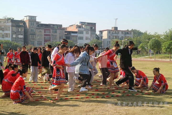 竹竿舞又稱跳竹竿,是一個以團隊合作為方式的舞蹈,具有濃厚的民族文化特色,是廣西壯族民間舞蹈形式之一。活動開始前,管理學(xué)院的同學(xué)們身穿民族服裝在田徑場跳起了竹竿舞,引來無數(shù)師生的觀看,隨后,圍觀的同學(xué)紛紛加入了跳竹竿舞的行列里。初練竹竿舞的同學(xué),有的因為跳錯了步伐就被夾掉了鞋子,有的因亂踩竹竿而仰面朝天。在經(jīng)過一系列的練習(xí)過后,學(xué)生們個個精神飽滿,動作標準到位,持竿者在音樂的節(jié)奏中蹲、站等姿勢變化多樣,在有節(jié)奏、有規(guī)律的碰擊聲里,跳舞者在竹竿分合的瞬間,在歡快的樂曲中,敏捷地進退,瀟灑地跨竿,演繹出美麗的舞蹈。