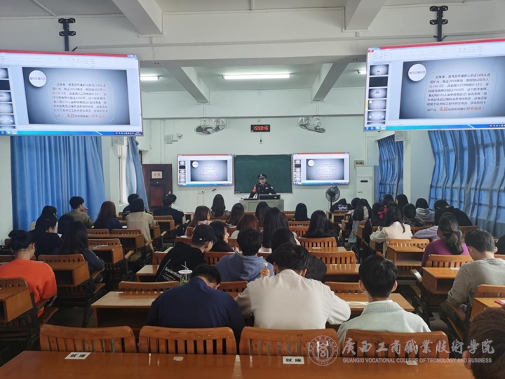 南寧市公安局公民警校的周巖教官從什么是電信詐騙、電信詐騙的特點、大學生可能接觸到的電信詐騙種類和防詐騙口訣等幾個方面進行了講解,并列舉了近年來常見的詐騙案例。邱靖翔教官更是結合自身辦案經驗,講述了大量的實際案例,讓同學們更加深刻地了解到電信詐騙的危害性。
