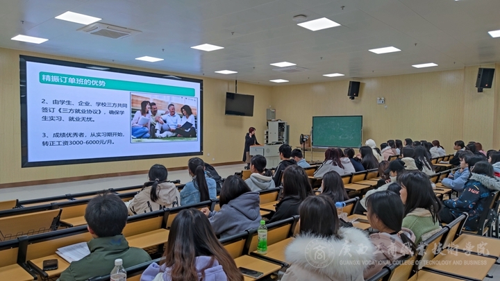 我院會計學院與南寧精振商務服務有限公司在2020級聯合開設訂單班。2020年12月31日上午,南寧精振商務服務有限公司到武鳴校區開展訂單班的宣講會。