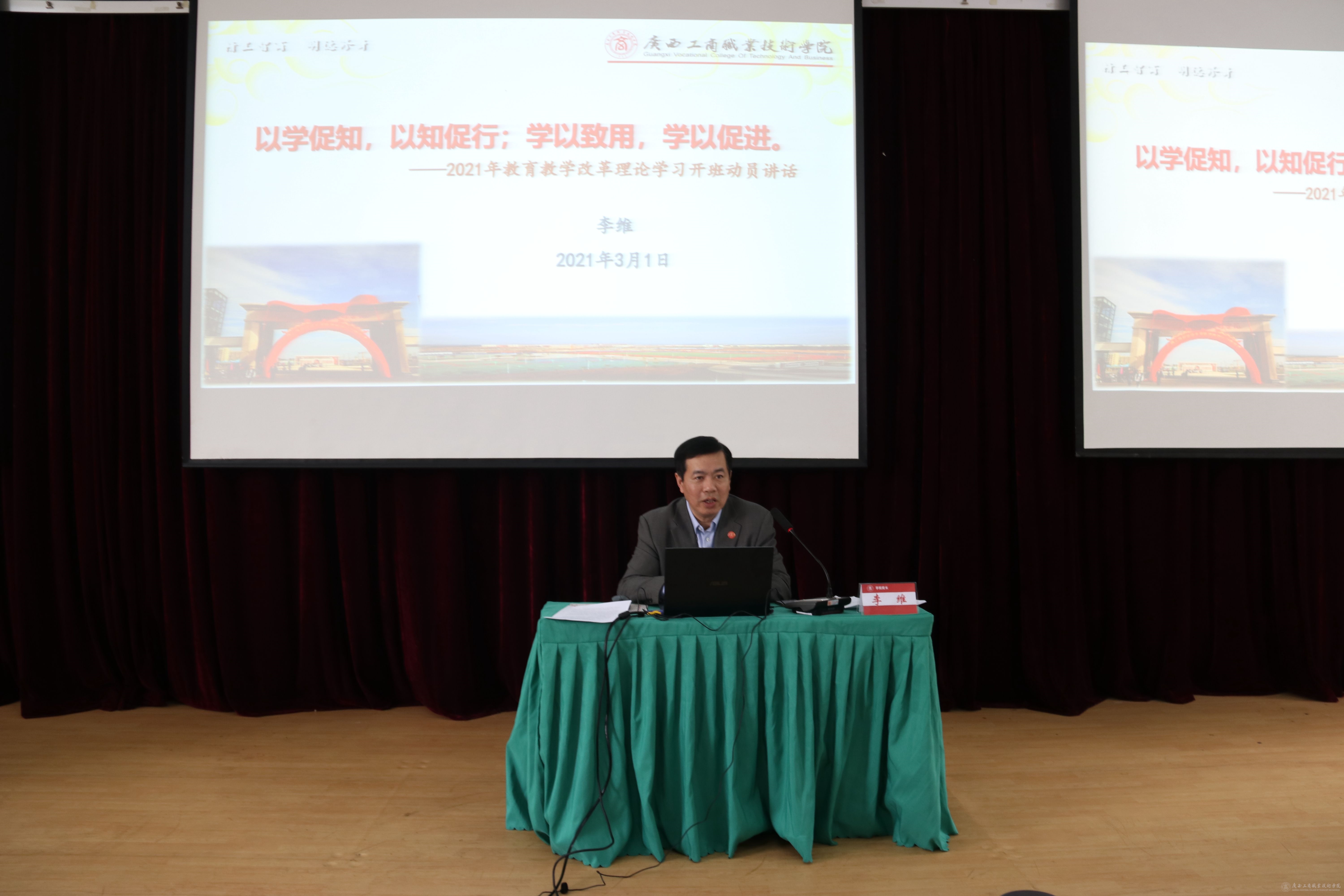 此次培訓,學院高度重視,積極行動,李維院長作了主題為“以學促進,以知促行;學以致用,學以促進”的理論學習動員講座。李維院長緊緊圍繞主題,旁征博引,層層深入,從“為什么學”、“學什么”、“怎么學”三個方面對學院今年和今后幾年的教育教學改革理論學習的內容和要求做了整體的規劃和思路,并對近期的重點工作做了部署。