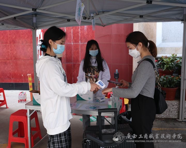 返校當日,學院在鵬飛、中堯、武鳴三個校區校門口設置返校學生進校通道及體溫異常復檢觀察區。返校學生均按要求佩戴口罩,配合教職工志愿者在指定區域有序排隊,做好行李消殺、口罩更換及消毒,有序掃碼、測溫,掃碼進入宿舍樓等流程,確保進校過程有序安全。