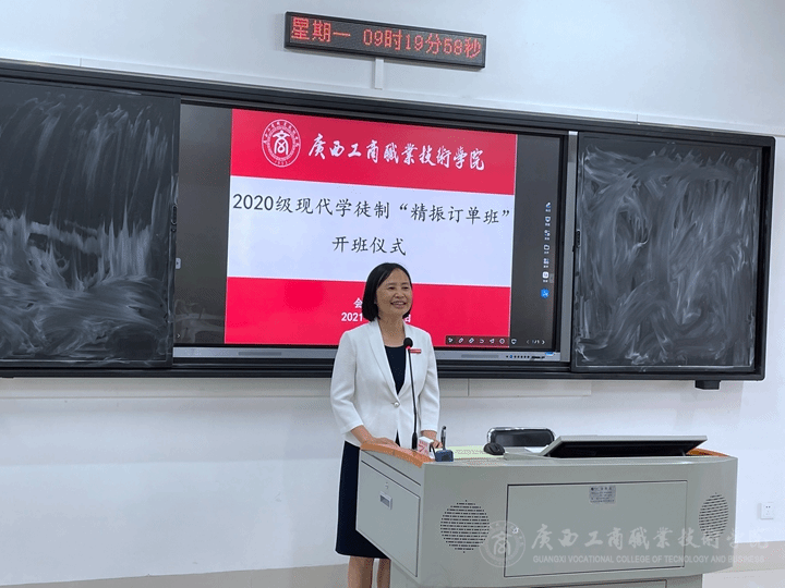 儀式開始,首先由會計學(xué)院院長粟衛(wèi)紅向大家介紹了現(xiàn)代學(xué)徒制訂單班的設(shè)立初衷和人才培養(yǎng)目標(biāo),并向企業(yè)導(dǎo)師團(tuán)隊和學(xué)生提出希望和要求。希望導(dǎo)師團(tuán)隊要以立德樹人為根本,把自己豐富的工作經(jīng)驗、愛崗敬業(yè)的奉獻(xiàn)精神通過言傳身教的方式傳遞給徒弟學(xué)員;學(xué)員要虛心向師傅學(xué)習(xí),勤奮學(xué)習(xí)、刻苦鉆研,秉承工匠精神,不斷豐富自我,完善自我。隨后,精振公司總經(jīng)理鐘思敏向大家介紹了參加本次開班式的各位企業(yè)導(dǎo)師?、公司文化、培育人才理念,并與同學(xué)們分享了職業(yè)生涯規(guī)劃和專業(yè)前景。
