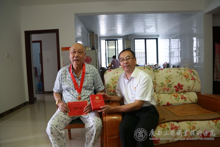6月28日一早,覃武云、韋云鳳帶隊(duì)來到87歲、64年黨齡的老黨員李晶同志家中。覃書記詳細(xì)了解李老的身體健康狀況,并向李老簡要通報(bào)學(xué)院當(dāng)前改革發(fā)展建設(shè)情況。覃書記代表學(xué)院為李老佩戴了“光榮在黨50年”紀(jì)念章,并送上慰問金、慰問品。因身體原因,李老說話非常吃力,李老的愛人代表李老向前來慰問的學(xué)院領(lǐng)導(dǎo)讀了其事先口述的信,他對組織的關(guān)懷表示感謝,并“希望后來的同志工作更好,讓共產(chǎn)主義事業(yè)在全世界興旺起來。”語句情意真切,感人肺腑。