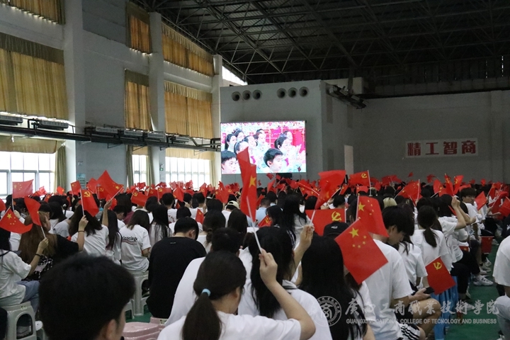 在鵬飛校區(qū)2119會議室,學院領導帶領中層以上黨員領導干部,離退休黨支部委員,民主黨派、黨外知識分子代表,學生代表百余人集中收看大會直播,在場領導、師生與天安門廣場同頻齊聲高唱國歌,在聆聽中共中央總書記、國家主席、中央軍委主席習近平發(fā)表的重要講話時,學生代表伴隨總書記鏗鏘有力的發(fā)言,自發(fā)揮舞小紅旗為黨深情祝福。