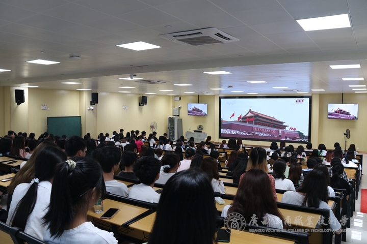 (學生代表在武鳴校區(qū)階梯教室觀看慶祝大會直播)