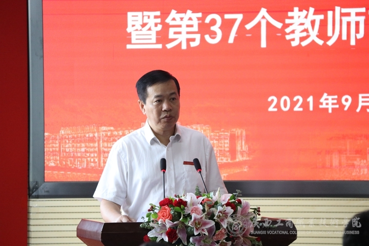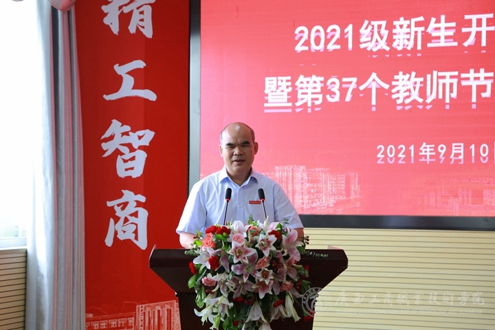 最后,覃武云書記講話,他代表全院師生對六千余名2021級新生致以最熱烈的歡迎和最真誠的祝賀,歡迎新同學來到廣商院,作為新一代大學生,將個人理想與中華民族偉大復興的中國夢相結合,為建設壯美廣西、建設社會主義現代化強國做出自己的貢獻。他代表學院黨委及領導班子向默默耕耘在教育教學第一線的廣大教師致以節日的問候,希望新入職教師牢記使命、磨練本領、扎根教育事業不斷奉獻,做好學生的引路人。